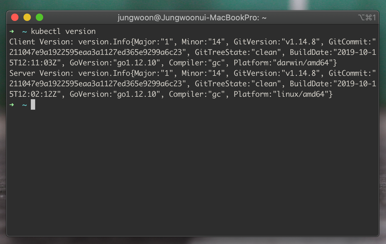 잘 설치가 되었는지 확인하기 위해서 터미널을 열고 $ kubectl version