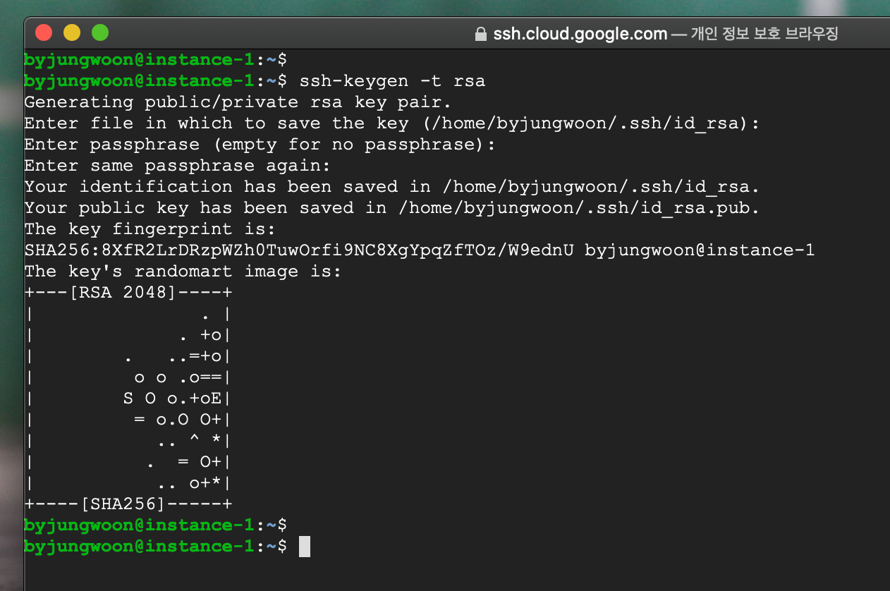 공개키 설정을 위해서 SSH 버튼을 눌러서 instance-1에 접속니다. (instance-1을 마스터로 사용할 예정)
